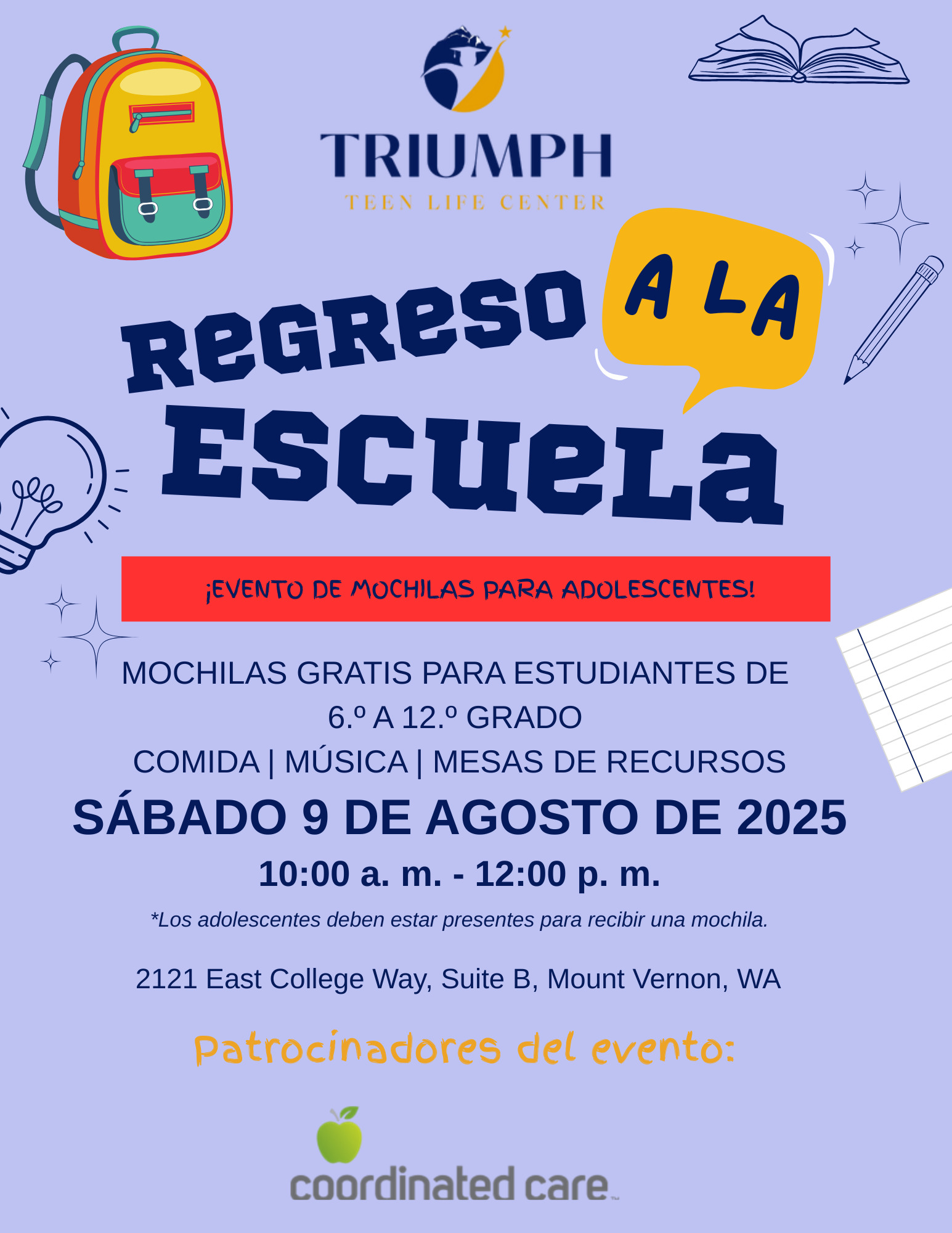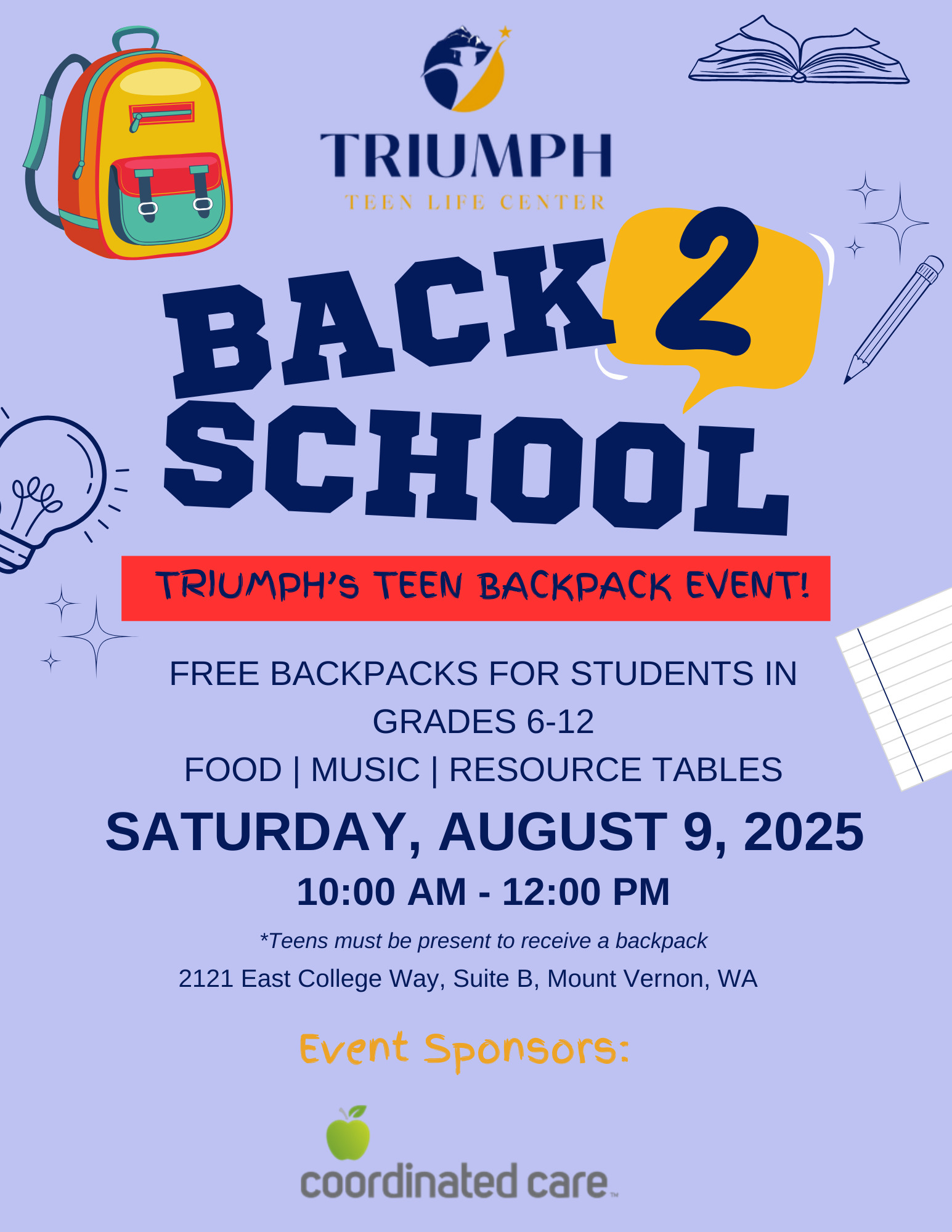 You’re Invited: Back 2 School Community Join us for a fun and family-friendly event as we gear up for the new school year! Triumph Teen Life Center will be giving away free backpacks and school supplies to over 1,000 local students. The event will also feature: Free Backpacks Community Resource Tables Music and Dance Free food Everyone is welcome!