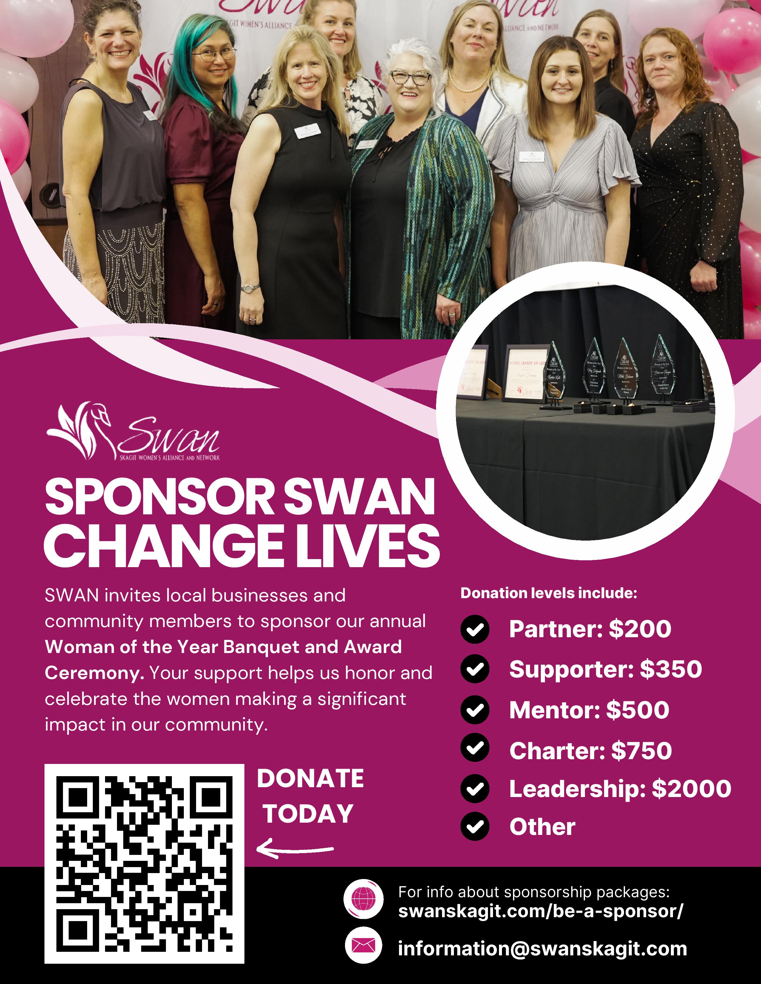 We invite businesses and community partners to join us as event sponsors. Sponsorship offers a meaningful way to celebrate leadership, gain community visibility, and align your brand with a powerful cause. Your support helps make this event possible and amplifies the impact of SWAN’s mission across Skagit County.
